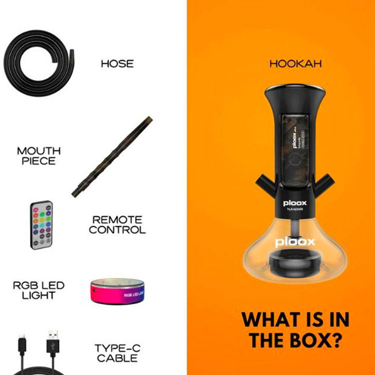 محتویات داخل کارتن قلیان پرتابلی قابل شارژ پلوکس
